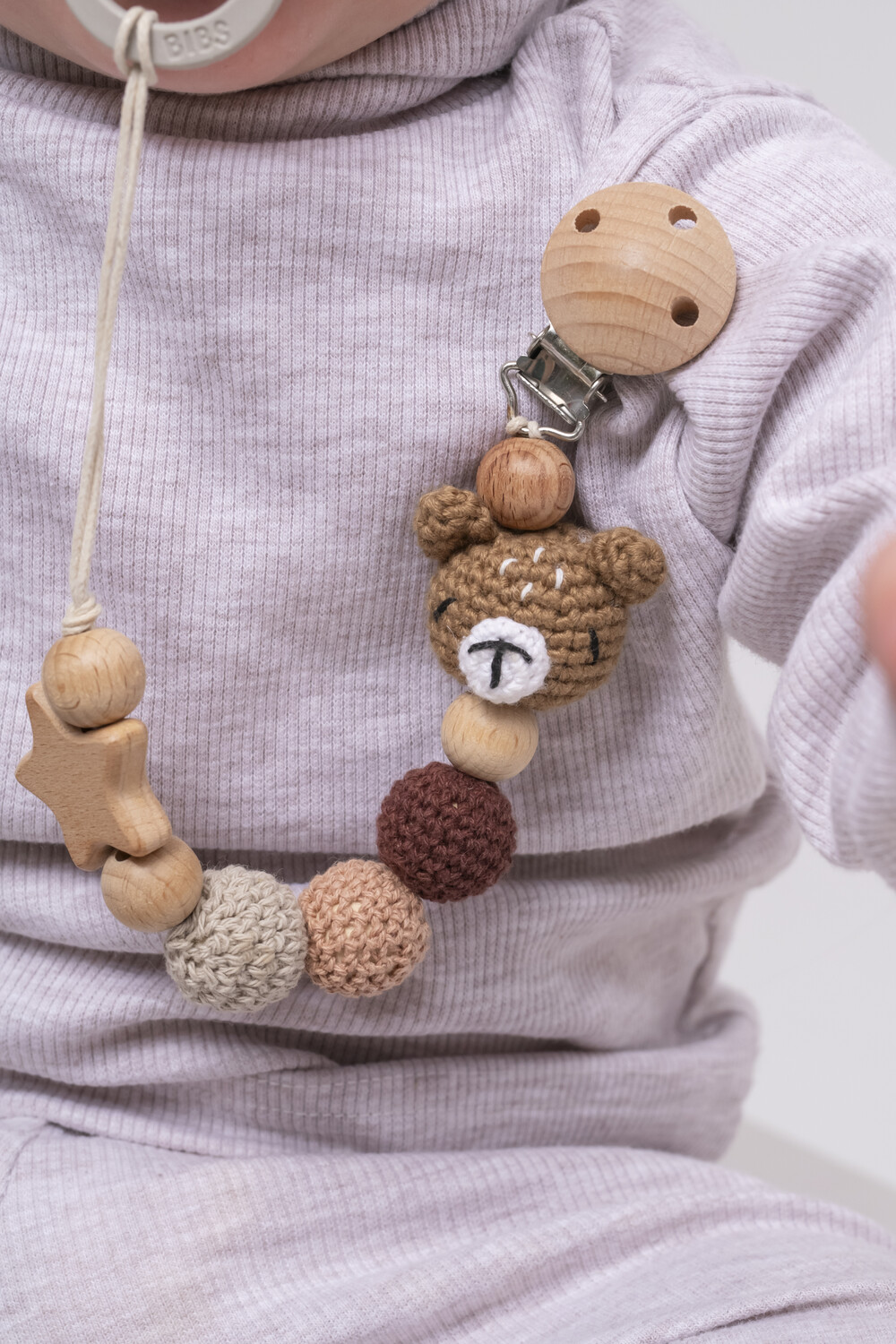 Держатель для пустышки с клипсой легко и надежно крепится на одежду, рюкзак или сумочку. Он помогает малышу изучать цвета и формы, развивает мелкую моторику, помогает при прорезывании зубов. Его интересный дизайн будет привлекать малыша, с ним можно играть.